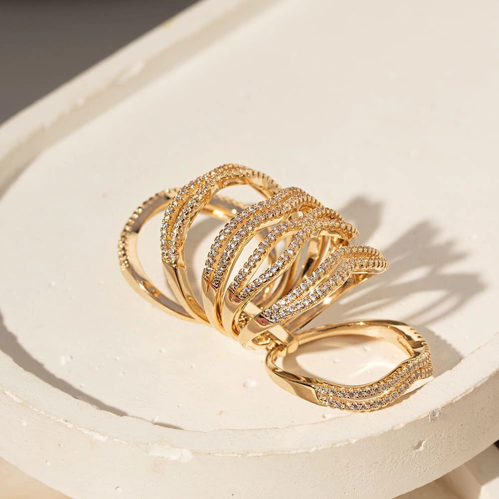 O anel Curvas 6 em 1 encanta com seu design versátil e sofisticado! Banho de ouro 18k e fileiras de zircônias brancas criam um brilho elegante e moderno. Pode ser usado junto ou separado, oferecendo seis combinações em uma única joia. Ideal para quem ama estilo, praticidade e o glamour das peças.